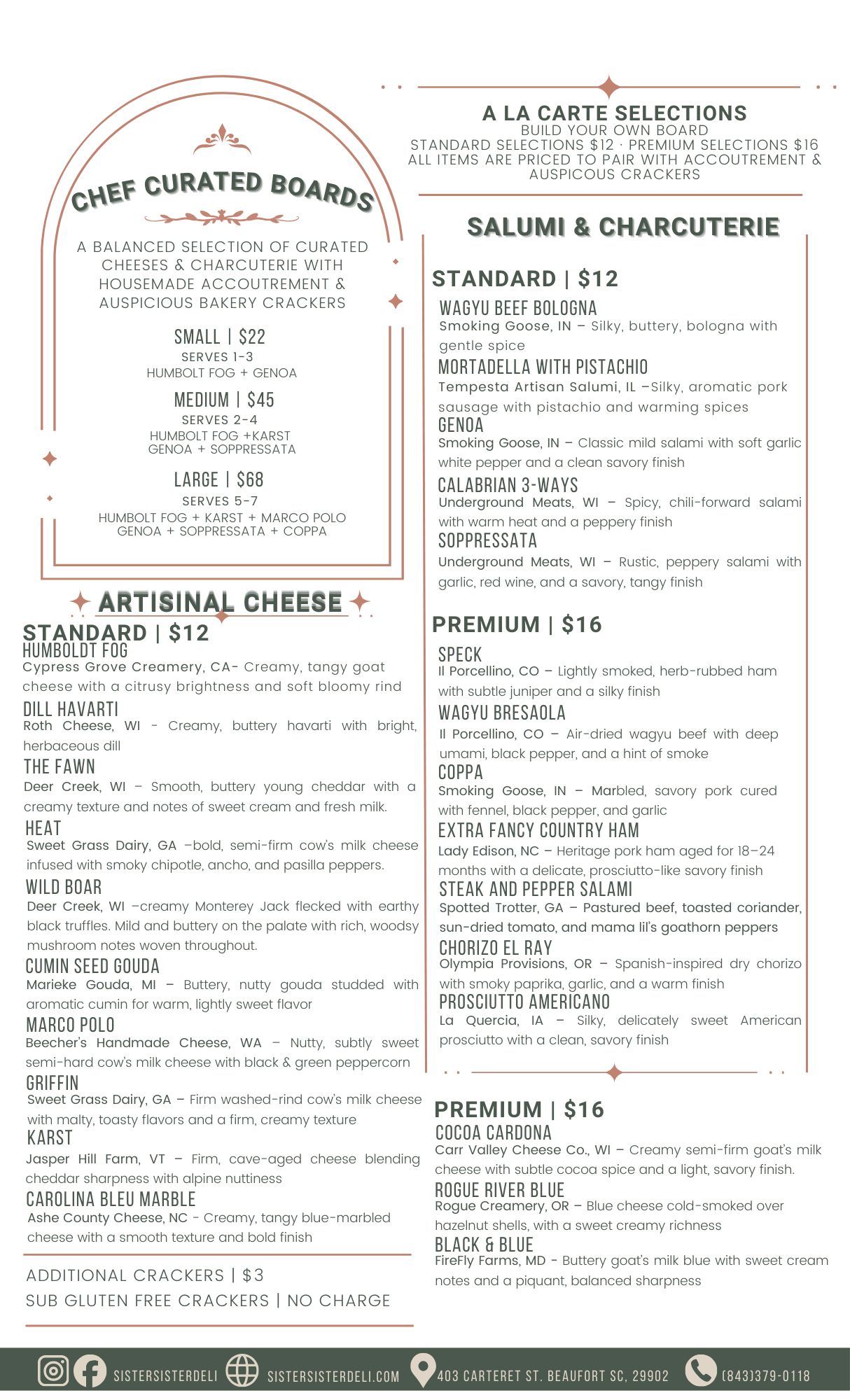 All boards are served with house made seasonal accouterments, including preserves & mustards, seasoned nuts, pickled vegetables, and crostini.